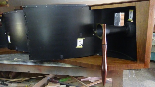 左右箱に、鋳造アルミホーン(ダミードライバー付)と前脚を取付けて位置関係を調整しました。