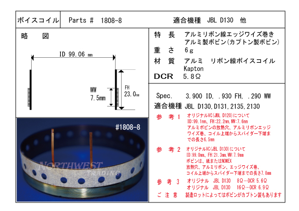 当社販売のボイスコイルです。ボビンはカプトン製です。こちらもアルミリボン線エッジワイズ巻きです。放熱孔の数もオリジナルと殆ど同じです。