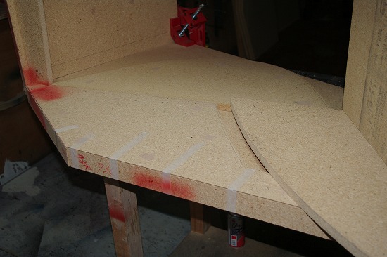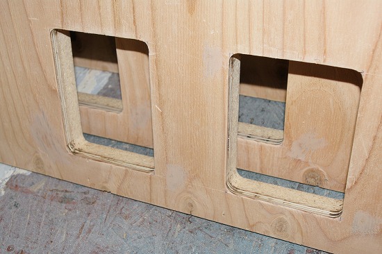 そこで、1/2インチ厚合板に3/4インチ厚(19ミリ厚)のパーチクルボードを貼って約32ミリ厚の裏蓋としました。