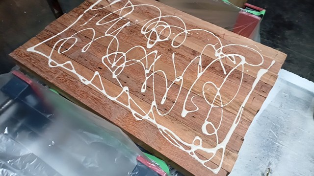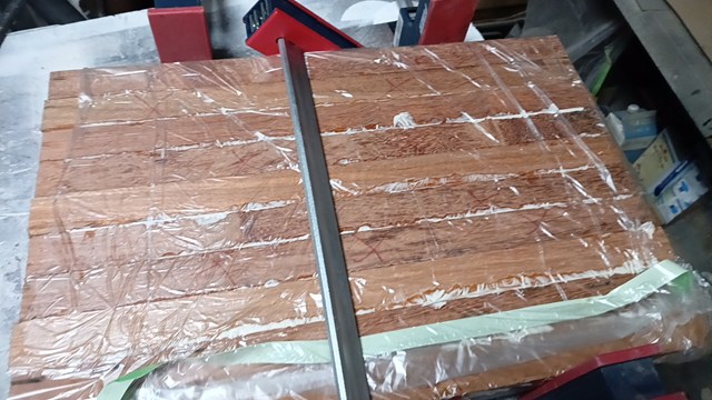 カッティングボードの制作 アピトン材をカット・接着 2026年04月05日 カッティングボードの制作 アピトン材をカット・接着を行いました。アピトン材をジョインとプレナーで表面を整えてから接着しました。アピトン材は、赤みが強くて、水にかなり強い樹種です。カッティングボード には最適な樹種です。 プレナーの幅が38㎝なので、それ以内に抑えています。食品衛生法に合致するようにタイトボンドⅢを使用しています。クランプで絞めています。 約6時間で確実に接着出来ます。