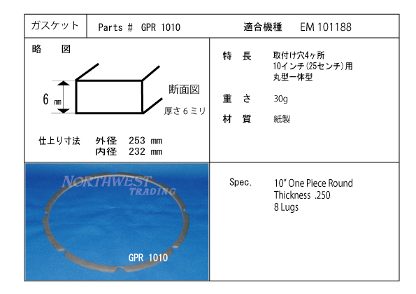 外径253ミリ 紙製 EM101188 ガスケットペア GPR1010